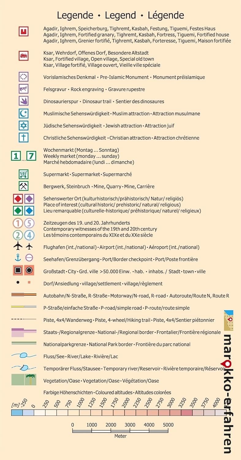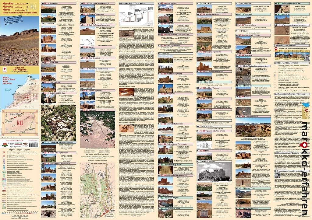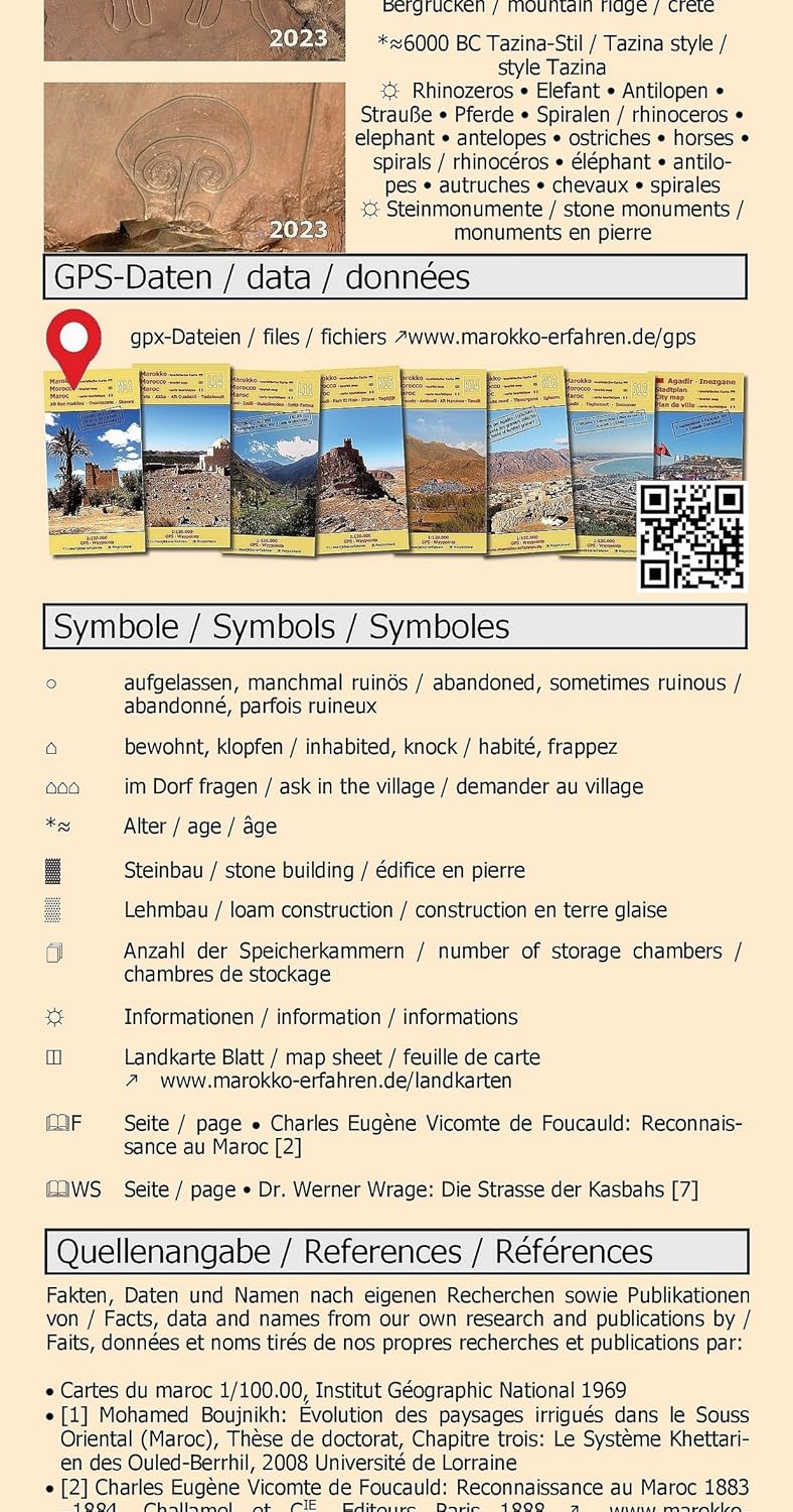 Drietalige (Duits/Engels/Frans) uiterst gedetailleerde toeristische kaart/reisgids van Marokko. Van de ruim 200 bestemmingen die op de kaartpagina zijn gemarkeerd, worden er bijna 100 gedetailleerder besproken op de reisgidspagina. Ruim 80 ervan zijn voorzien van coördinaten. Achtergrondinformatie over de geschiedenis, bezienswaardigheden en andere bijzonderheden zijn inbegrepen. Talrijke rotstekeningen op verschillende locaties, bijvoorbeeld in Foum Chenna en Oued Ouigane. - Talrijke kasbahs rond Toundoute, Skoura en El Kelâa. M'Gouna - Khettaras in de oase van Skoura-N'Kob, de stad met 45 Kasbahs - woonkastelen b.v. B. in Sidi Flah en Ouled Merzoud - Rotsgravures in Imi n'Oudraz, Tanoumrit en Handour - Steencirkels - Geologische kenmerken in de Jbel Sarhro - Beschrijvingen door Charles de Foucauld en Werner Wrage - Wekelijkse marktdagen (souks) De Jbel Sarhro - een buitengewoon bergmassief - presenteert niet alleen zijn geologische kenmerken. Talrijke opslagkastelen, rotstekeningen en pre-islamitische monumenten (tumuli?) getuigen van een lange menselijke aanwezigheid. Tijdens het wandelen in de regio kun je zelfs kleine watervallen en poelen tegenkomen in vrijwel ongerepte valleien die uitnodigen om jezelf op te frissen. Ook in de vlaktes rond de bergketen vindt al lange tijd nederzetting plaats. Talrijke prachtige en deels zeer hoge kleigebouwen duiden op een geavanceerde bouwmethode waarbij niets aan het toeval werd overgelaten. Omdat vestiging in Skoura ooit alleen mogelijk was via watervoorziening via ondergrondse kanalen, beschrijft een gedetailleerd tekstartikel de geschiedenis en constructie van dit buitengewone systeem. de Khettaras. De ontdekkingsreizigers Charles de Foucauld en Werner Wrage brengen in hun beschrijvingen hulde aan deze regio. Prof. dr. Herbert Popp draagt ??twee bijzondere luchtfoto's bij uit zijn archief. Cartografisch advies van Prof. Dr. Uwe Ulrich Jäschke.Reviews
