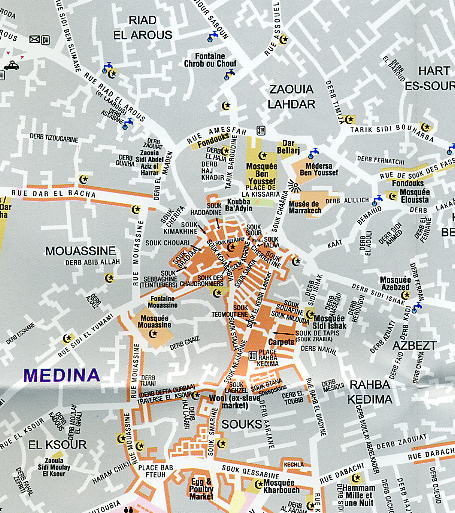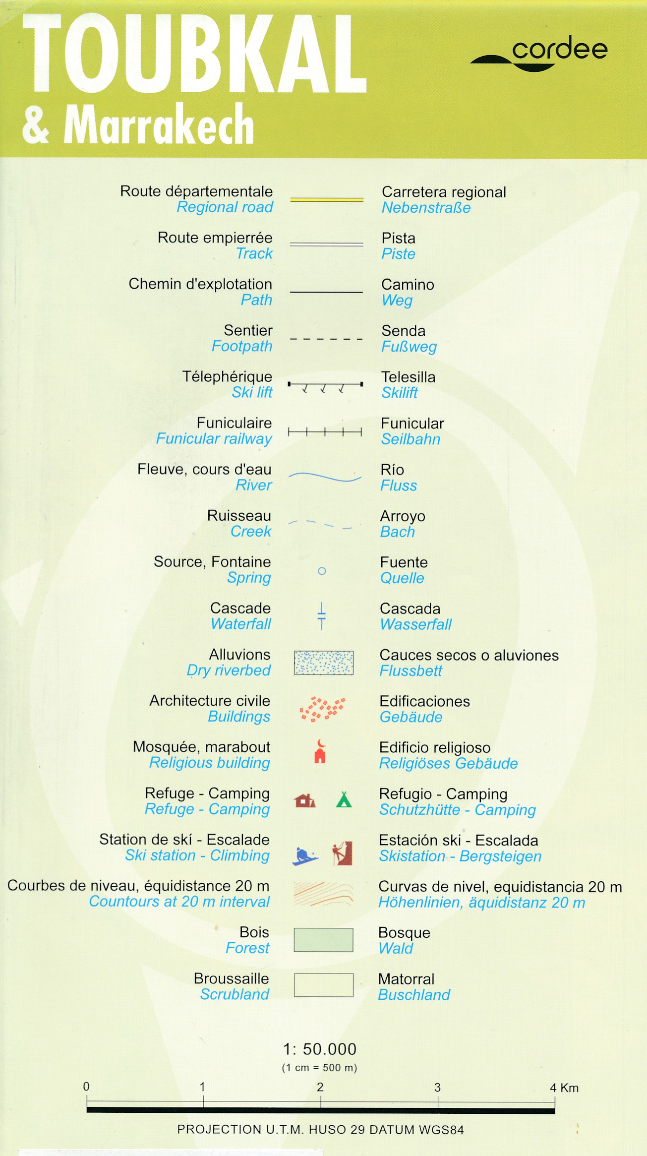 A detailed, accurate and up-to-date trekking map of Jebel Toubkal in the High Atlas mountains of Morocco, the highest peak in North Africa and popular trekking destination. A street plan of Marrakech is on the reverse. 1:50,000 topographic map detail includes contours at 20m intervals, hill-shading, woodland and scrub areas, springs, creeks, rivers and dry riverbeds. Road detail includes tracks and footpaths, and funicular railways and ski-lifts are also indicated. Isolated buildings are marked and symbols show ski-stations, refuges and religious buildings. A 1km UTM grid is drawn over the map and margin ticks are at 1’ intervals. n the reverse is a clear plan of Marrakech at approximately 1:8,700. It covers the Medina district and extends westwards to the main railway terminus. Colours highlight main sites of interest, public buildings, shopping areas/markets and pedestrian zones. One-way streets are marked and symbols show a range of useful features e.g. hotels, taxi ranks, car parks, information offices, petrol stations, public water fountains, places of worship, police stations, hospitals etc.