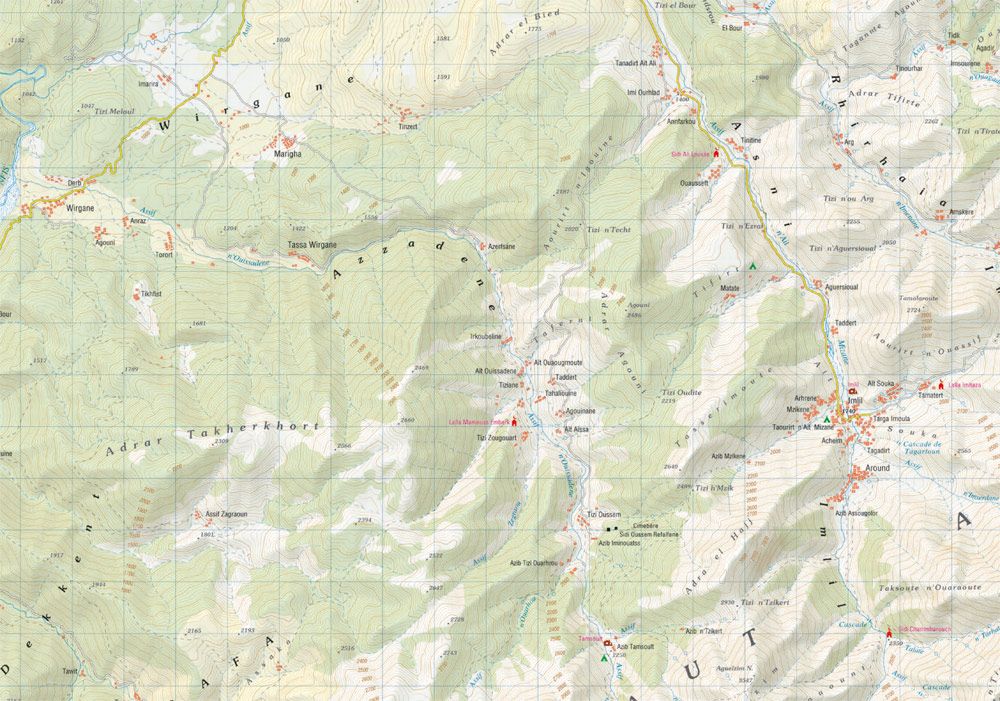 Meest gedetailleerde kaart verkrijgbaar voor de Hoge Atlas. Geschikt voor globale navigatie. Hoofdtoppen, hutten en belangrijke wegen en paden zijn aangegeven. Hoogtelijnen geven een indruk van het landschap, maar concrete details ontbreken, waardoor alles er glooiend uit ziet.