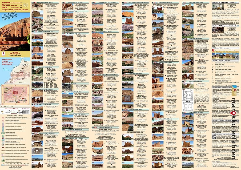N10: Aït Bouguemez - M’Semrir - Boumalne Dadès - Kelâa M’Gouna + Straße der Kasbahs III + GPS-Waypoint Deutsch / Englisch / Französisch | 1:120.000 | ca. 84 x 59 cm | gefaltet 10,5 x 20 cm | zahlreiche Fotos | Dreisprachige (de. / en. / frz.) äußerst detaillierte touristische Landkarte / Reiseführer von Marokko. Von den über 200 auf der Kartenseite markierten Zielen werden mehr als 150 auf der Reiseführerseite detaillierter beschrieben und sind mit Koordinatenangaben versehen. Mit Hintergrund-Informationen zur Geschichte, zu Besichtigungsmöglichkeiten und weiteren Besonderheiten. • Wanderungen in nahezu unberührter Natur rund um den Jbel M’Goun • Apfelparadies auf fast 1800m Höhe im Aït Bouguemez-Tal • faszinierende Wohnburgen in authentischen Dörfern • Fahrspaß auf der bekannten Serpentinenstraße im Dadès-Tal • Höhlen - einst auch bewohnt - und Quellen nicht nur im Rosen-tal • Ighrem Sidi Mossa in exponierter Lage • beeindruckende Passquerungen durch den Hohen Atlas • Kasbahs in Toundoute, Boumalne Dadès und El-Kelâa M’Gouna • Hinweise auf Beschreibungen von Charles de Foucauld und Werner Wrage • Wochenmarkttage (Souks) Das Blatt wird dominiert von den drei Hauptflüssen im Aït Bouguemez- und im Dadès-Tal sowie im Tal des M’Goun, dessen Unterlauf als Tal der Rosen bezeichnet wird. Eine Ballung an Sehenswürdigkeiten entlang dieser Täler sorgt für eine neue Strukturierung der Ziele auf der Reiseführerseite. Innerhalb der Grenzen des Geoparc UNESCO du M'Goun wird auf interessante Punkte hingewiesen. Ein guter Mix zwischen dicht besiedelten Tälern mit lebhafter Infrastruktur und der Einsamkeit in ländlichen Bereichen lädt zum Verweilen ein. In einer stillgelegten Salzmine im Tal des Oued Tabia überraschen bizarre Salzkristalle. Dinosaurier haben überall ihre Spuren hinterlassen, in manch einer Grotte spürt man noch die Anwesenheit ehemaliger Bewohner. Freunde der Berberarchitektur sind in den Tälern gut aufgehoben. Bauwerke von teils beachtlicher Höhe in verschiedenen Erhaltungszuständen sind dankbare Fotomotive, können teilweise besichtig werden. Auch auf diesem Blatt besticht erneut die Kombination von Sehenswürdigkeiten und herrlicher Natur. Kartographische Beratung durch Prof. Dr. Uwe Ulrich Jäschke, Dresden Konzept und Realisierung www.marokko-erfahren.de Weitere Informationen: www.marokko-erfahren.de/informieren/landkarten-marokko-erfahren/n10-ait-bouguemez-msemrir-boumalne-dades-kelaa-mgouna-strasse-der-kasbahs-iii
