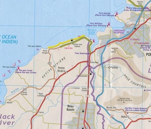Op zich handige kaart (in het Engels, let op: in Mauritius is vrijwel alles in het Frans). De afgelopen 6 jaar is er hard gewerkt in Mauritius aan het wegennet hetgeen heeft geresulteerd dat er sinds december 2013 een nieuw snelweg is geopend tussen de Zuid en Noord verbinding van het land (M1 en M3) oostelijk om Port Louis heen dwars door de bergen. Het hele wegennet met alle hierop aansluitende wegen heeft daarmee een enorme verbetering ondergaan. Gevolg is dat deze kaart daarmee in 1 klap out-of-date is. Er zal een nieuwe in 2014 aangepaste versie moeten komen.