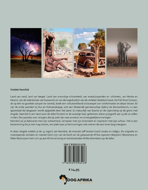 Ontdek Namibië Land van zand, land van leegte. Land van oneindige schoonheid, van woestijnpaarden en -olifanten, van Himba en Herero, van de rode duinen van Sossusvlei en van de ruige kustlijn van de verlaten Skeleton Coast. De Fish River Canyon, de op één na grootste canyon ter wereld, biedt een indrukwekkend schouwspel van rotsformaties en diepe kloven. Er zijn de wilde paarden bij Aus en Kolmanskoppe, ooit een bloeiende gemeenschap tijdens de diamantkoorts, nu een spookstad die langzaam wordt opgeslokt door het zand. En natuurlijk van Etosha en de Caprivistrip op de grens met Angola. Namibië is een land waar de stilte fluistert en de woestijn haar geheimen alleen prijsgeeft aan zij die ze willen vinden. Een paradijs voor reizigers die op zoek zijn naar avontuur en onvergetelijke ervaringen. Namibië zal je betoveren met zijn schoonheid, verrassen met zijn diversiteit en inspireren met zijn cultuur. Het is een bestemming die je niet mag missen, een plek waar je herinneringen zult creëren die een leven lang meegaan. In deze reisgids ontdek je de 14 regio’s van Namibië, de mooiste (off beaten track) routes en lodges. De originele en meeslepende verhalen en meeste foto’s zijn van de hand van de gelauwerde Afrika-reporters Marjolein Westerterp en Peter Boshuijzen met ruim 30 jaar Afrika-ervaring en tienduizenden Afrika-kilometers op de teller.Reviews