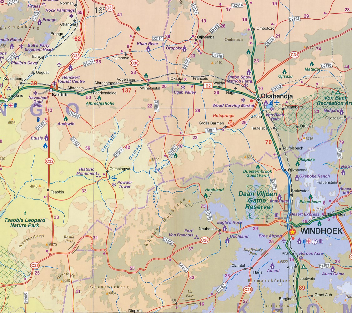 Misschien zijn er in Namibië nog betere kaarten, maar deze was veruit de best die ik hier kon krijgen en zeer nuttig om de reis te plannen. Grootte van de schaal is ook zeer gunstig in vergelijking van andere kaarten