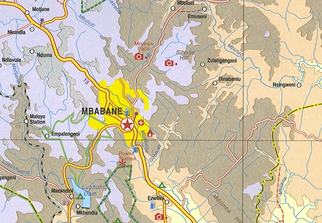 Road and travel map. Distinguishes roads ranging from paved highways to unpaved minor roads. Distance chart with many towns. Railways, airports, aerodromes, small aircraft facilities. Gasoline / petrol stations, post offices, bus stations, hospitals / medical facilities, border posts, scenic vistas, historical and archeological sites, museums, mines, information centers. Rest houses and hostels, campsites or huts, missions, churches, mosques, points of interest. Inset map of Mbabane with streets named directly on the map, shopping areas and parks. Brief text descriptions of Geography, Weather, History, People, Game and Nature Reserves, Economy. Scale 1:250,000.