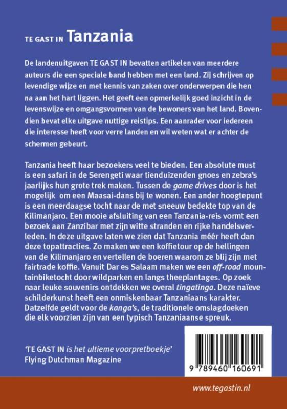 TE GAST IN Tanzania (3e druk, 2017) is samengesteld door en voor reizigers: verhalen van auteurs die er gewoond of gereisd hebben. Met veel insiders informatie over land en bevolking. Om je bezoek nog beter voor te bereiden en je in te leven in de cultuur van de lokale bevolking, is de pocketreeks 'Te gast in' ideaal. Een handzaam en compact boekje met vlot leesbare artikelen die een praktische tips bevatten voor je reis naar Tanzania.
