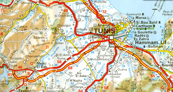 The Michelin National road map of Tunisia at 1:800,000 scale is ideal for trip & route planning. The map gives comprehensive coverage of national road networks showing all major motorways, dual carriageways, national & regional main roads and some local roads. Also shows unsurfaced roads & tracks and major footpaths. Road obstacles & dangers including steep slopes, seasonally impassable routes, height restrictions, one-way roads, tolls, narrow bridges & high passes are indicated.