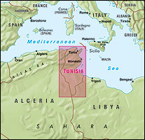 On one side is a road map of Tunisia, with the country’s southernmost tip shown as an inset. Topography is presented by vivid relief shading, with numerous spot and names of mountain ranges or deserts. Salt pans and seasonal rivers and lakes are marked, as well as oasis and wells or watering points. National parks and other protected area are highlighted.