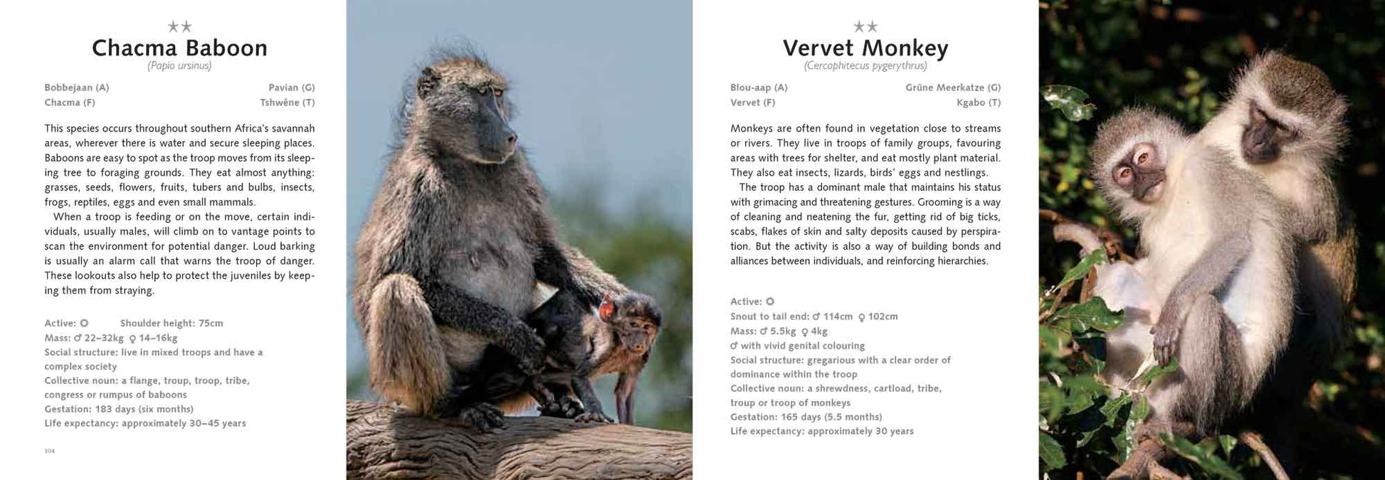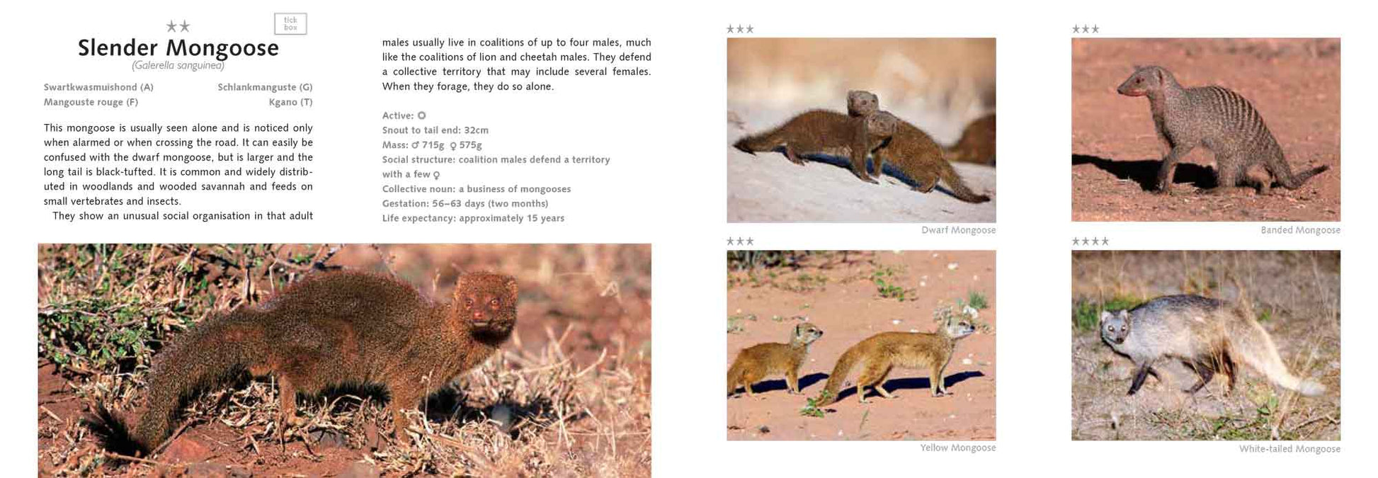 The perfect companion to any foray into the savannah, Madikwe Game Drive includes not only beautiful photographs of a wide array of birds, mammals and reptiles, but informative text which is both extremely compact and highly comprehensive. All statistics that could conceivably help a viewer to identify, catalogue and learn about each animal are provided in concise and clear format. The Latin and colloquial names for each animal are included, along with the Afrikaans, French, German and Zulu names. The listings are given ratings for rarity of sightings, and each animal a tick box for viewers to mark upon sighting.