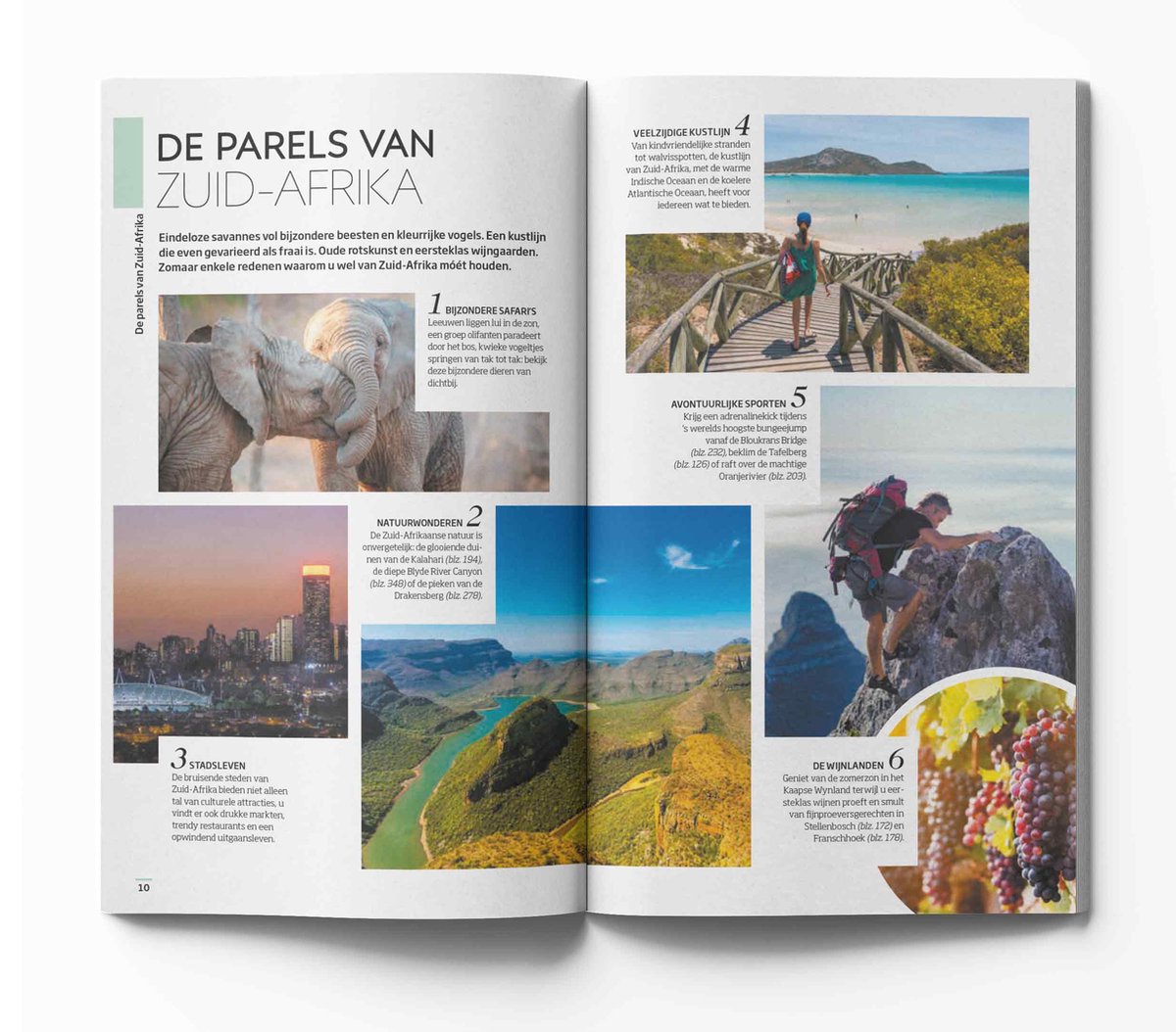 Deze reisgids verdeelt Zuid-Afrika in elf gebieden: Kaapstad, Kaapse Schiereiland, Kaapse Wynland en de westkust, Noordkaap en Vrijstaat, Hermanus en de Overberg, de Tuinroute, Oost-Kaap, KwaZulu-Natal en Lesotho, Johannesburg en omgeving, Limpopo, Mpumalanga en Kruger en Eswatini. Geniet van het levendige Kaapstad en Johannesburg, verdiep je in de tumultueuze geschiedenis in het Apartheid Museum en bewonder het natuurschoon van het Kruger National Park en de Tafelberg; deze reisgids toont je de parels van Zuid-Afrika.