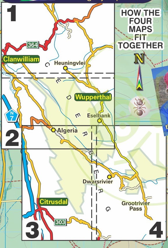 There are two double-sided A1-sized maps in the set (i.e., four maps in all), covering the entire Cederberg Wilderness and extending north to Wolfdrif and south to Mount Ceder.