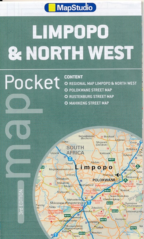 This updated edition provincial pocket map of Limpopo and North West now includes Mafikeng and is conveniently pocket sized. The provincial map contains national roads, main and minor roads, topographic details, route numbers, places of interest and historic sites, airports and airflieds, national parks and reserves, border crossings and a detailed index of place names. The map includes routes to Kruger National Park, Johannesburg, Kuruman and Zululand (St Lucia). The map contains detailed street plans of Polokwane (Limpopo Province) and Rustenburg (North West Province) showing main and minor roads, retail areas, traffic light positions, hotels and accommodation, theatres and cinemas, shopping malls, parking, one-way streets, sport and recreation areas, railways and stations, suburb names and an index of street names.