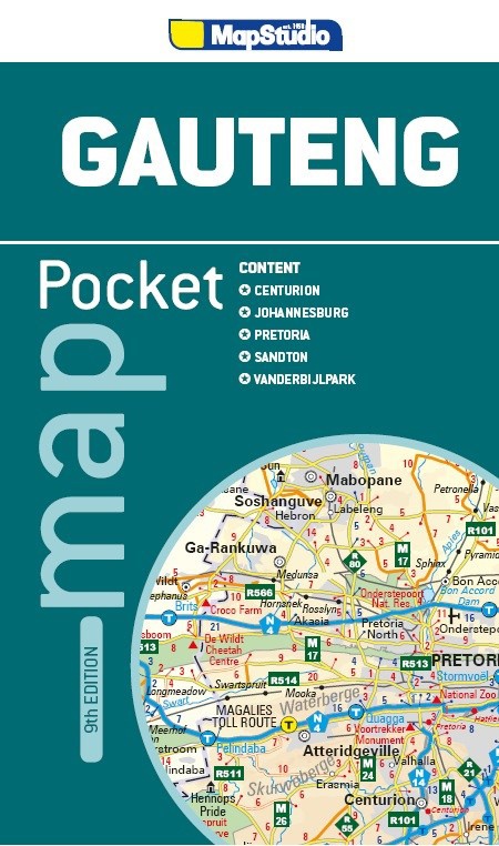 This pocket map includes an index to place names and shows street names, suburb names, town names, freeways, interchanges, route numbers, places of interest, accommodation, schools, hospitals and clinics, nature reserves and parks, tourist information. Coverage: detailed map of Gauteng at a scale of 1 : 550 000, includes central town plans of Johannesburg & Pretoria at a 1 : 10 000 scale.