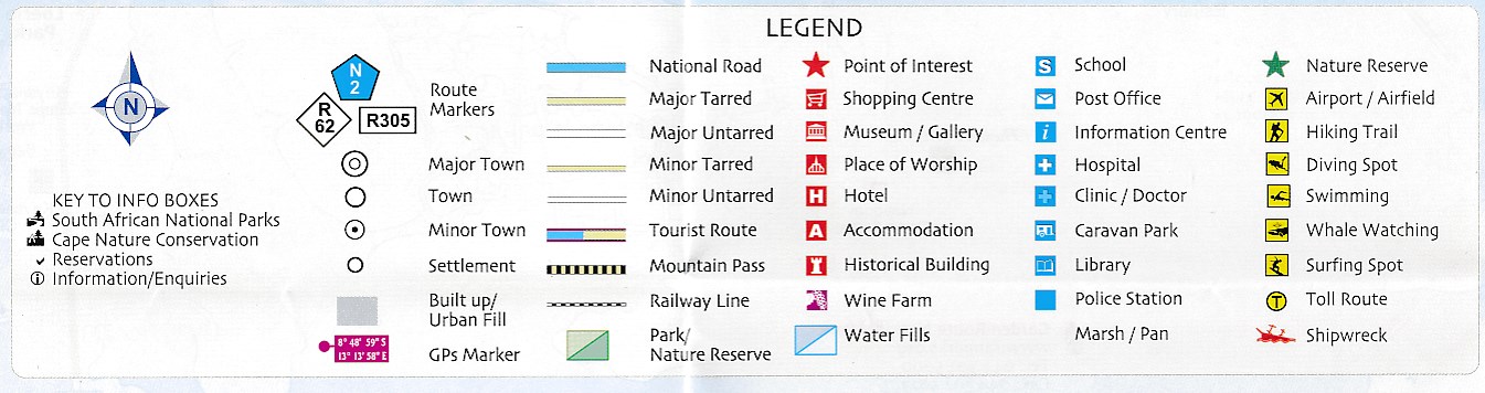 Wegenkaart van een deel van Zuid Afrika met inzetten van de meest belangrijke gebieden. Het overzicht is soms misschien een beetje onduidelijk. maar de details in de inzetten en delen van de kaart zijn prima en voldoen goed voor het rondrijden met een eigen auto.