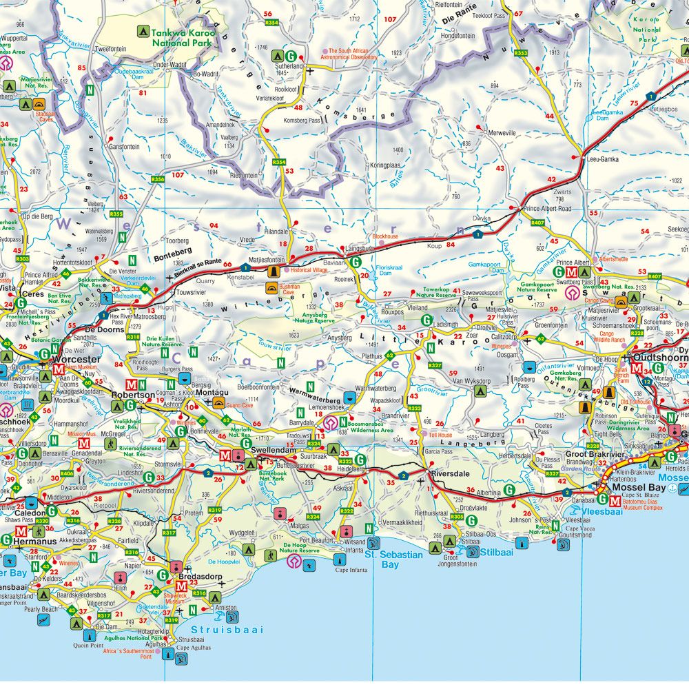 In het kaartbeeld wordt door middel van schaduw het reliëf weergegeven en soms enkele punten in het landschap met de daadwerkelijke hoogte. Provinciegrenzen zijn goed terug te vinden, nationale parken en reservaten ook. Met allerhande symbolen worden toeristische bezienswaardigheden weergegeven als monumenten, historisch belangrijke plekken en uitzichtpunten. In bepaalde plaatsen zijn hotels en campings te vinden, luchthavens, treinverbindingen en havens vindt u er ook op!