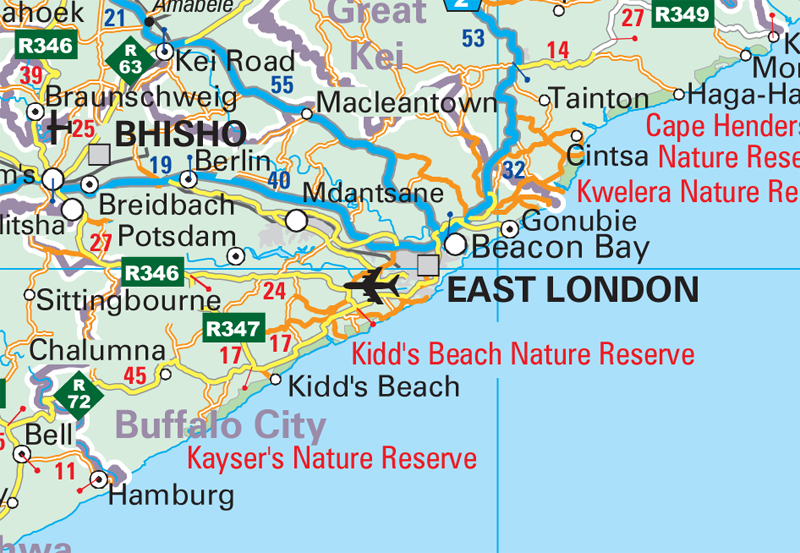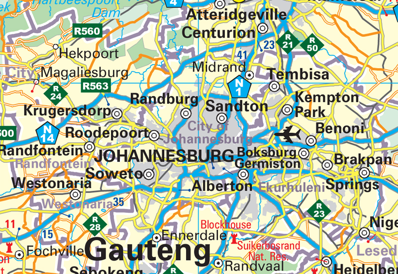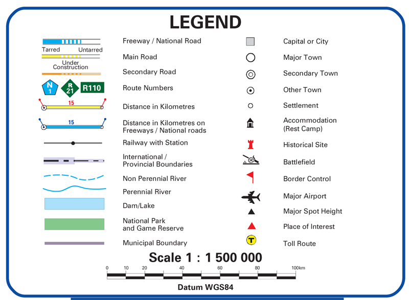 The General Information Wall Map of South Africa contains new updated data from our reliable map database. The 9 provinces of South Africa are colour-coded for clarity. Map content includes international, provincial and municipal boundaries, major and main road with route markers, distances between junctions, airports and airfields, national parks and nature reserves, toll routes, places of interest, spot heights and an index of place names and municipal areas.