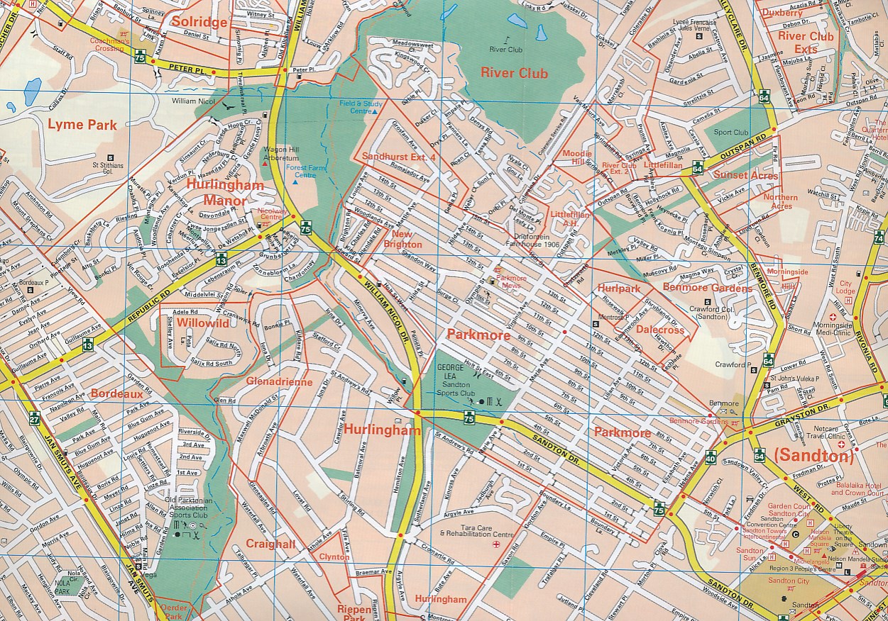 Uitgebreide stadsplattegrond van Johannesburg, Randburg, Sandton en directe omgeving.