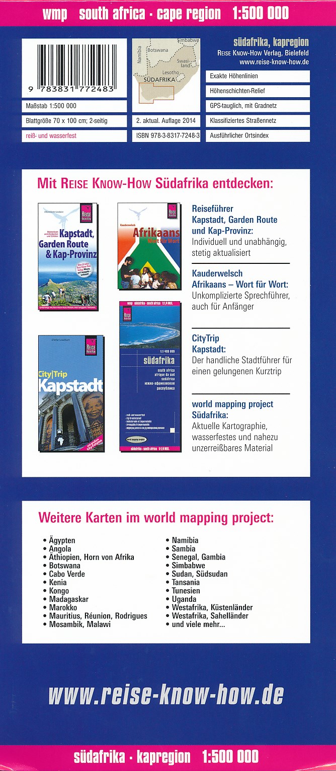 Cape Region of South Africa, including the whole of the Garden Route, at 1:500,000 on a light, waterproof and tear-resistant, indexed road map with a street plan of Cape Town and a map of the Cape Peninsula, published by Reise Know-How as part of their highly acclaimed World Mapping Project.