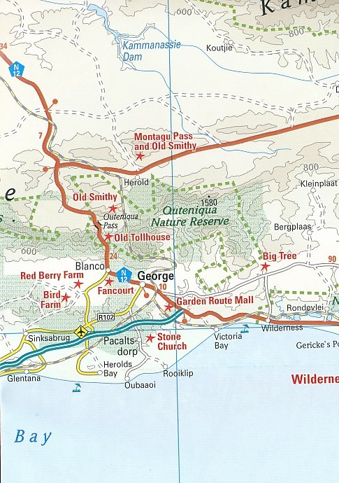 The map is double-sided to provide the best balance between a good scale and a convenient size sheet, and divides the region east/west. On the western part coverage within the Western Cape Province extends north to just beyond Bitterfontein and 31° latitude, and includes part of the Northern Cape Province with the Hantamdberg, Roggeveldberge and Komsberge mountains and the Tankwa-Karoo National Park. The eastern half of the map extends beyond Port Elizabeth to Grahamstown and inland to Karoo National Park and Camdeboo NP and Mountain Zebra NP.