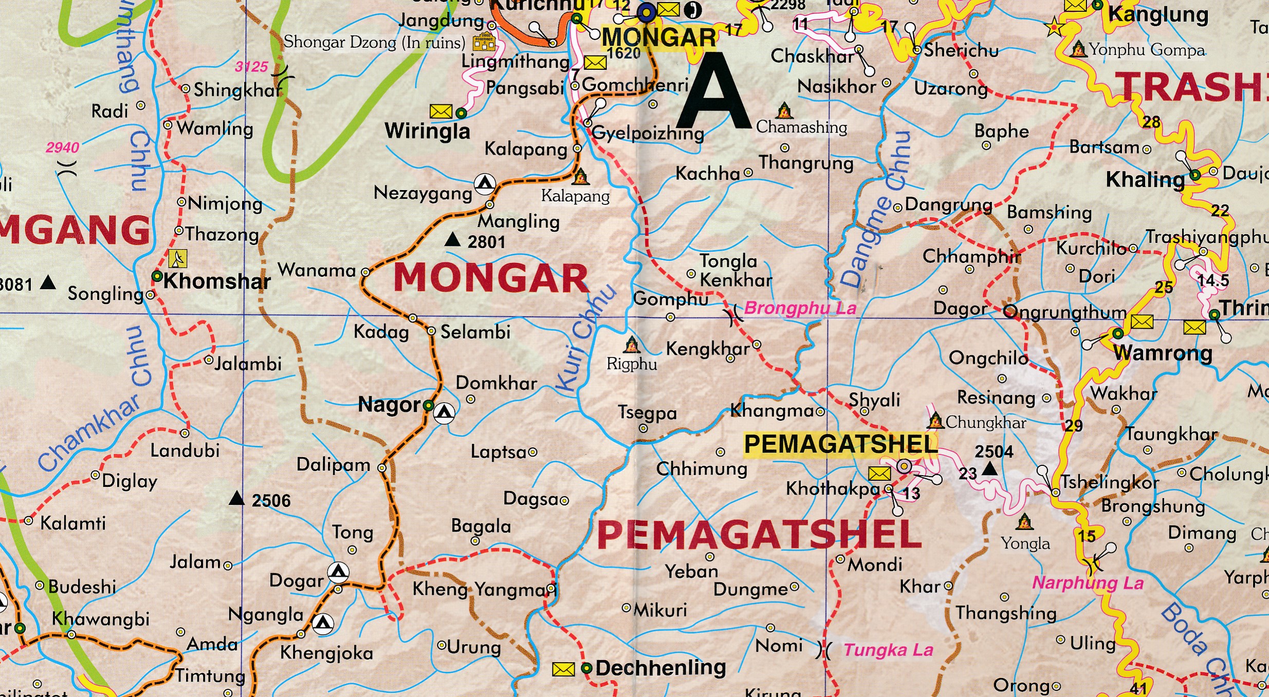 Wegenkaart en Trekking map van Bhutan. Overzichtskaart met alle plaatsen, wegen en nationale parken, maar ook ingetekende trekkingroutes met de hoogte passen die belpoen moeten worden. Bumthang trek, Chelela trek, Degala trek, Gangtey trek, Jomolhari trek, Laya-Gasa trek Punakha trek, Rodungla trek, Laya-Gasa trek, Punakha trek, Rodungla trek, Sakten trek, Samtengang Trek.
