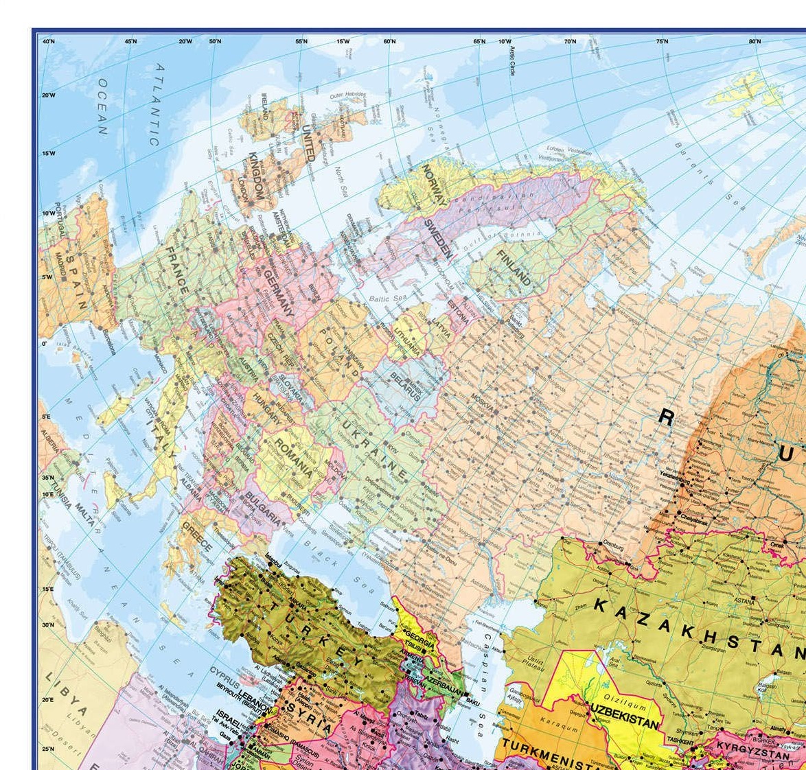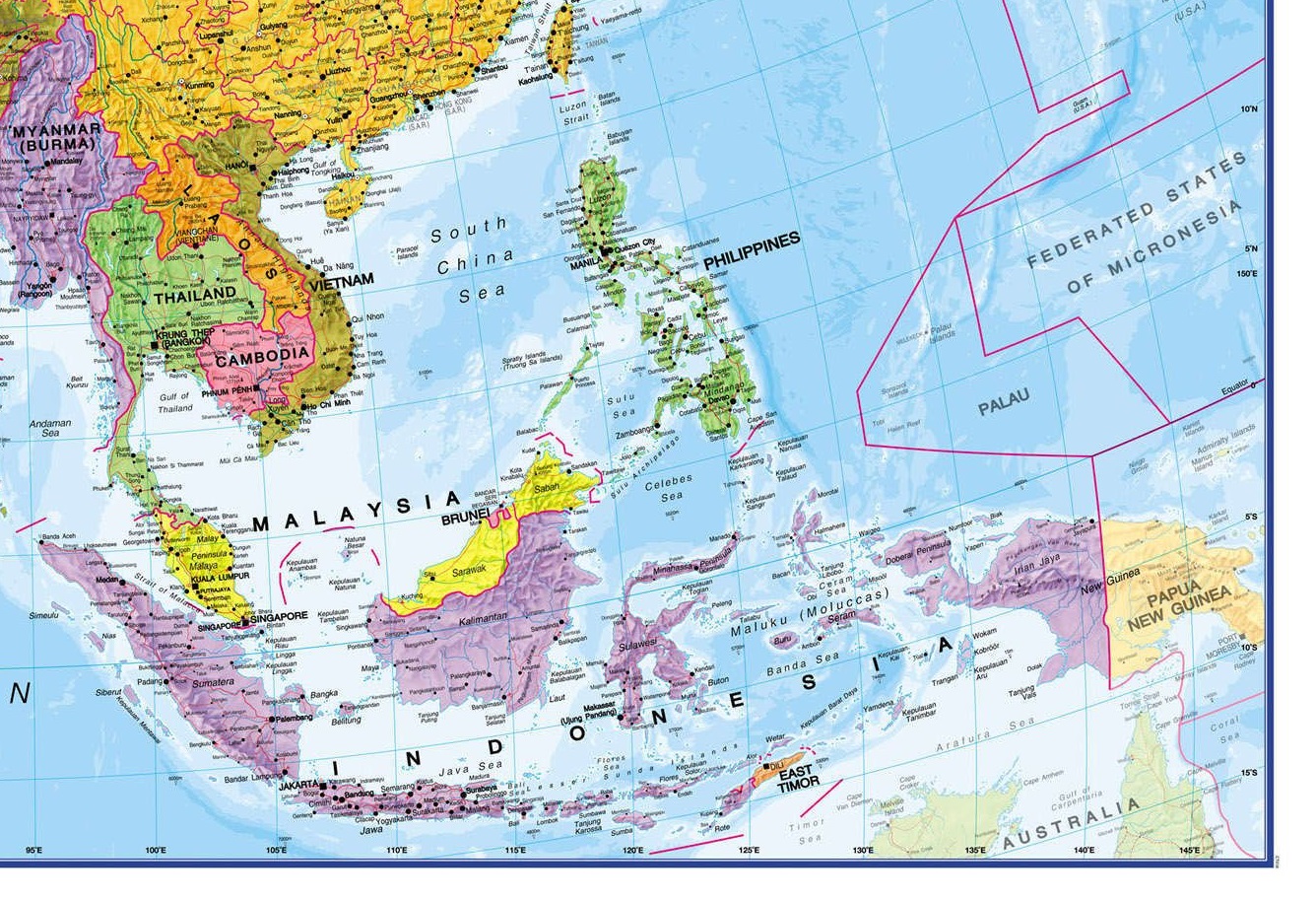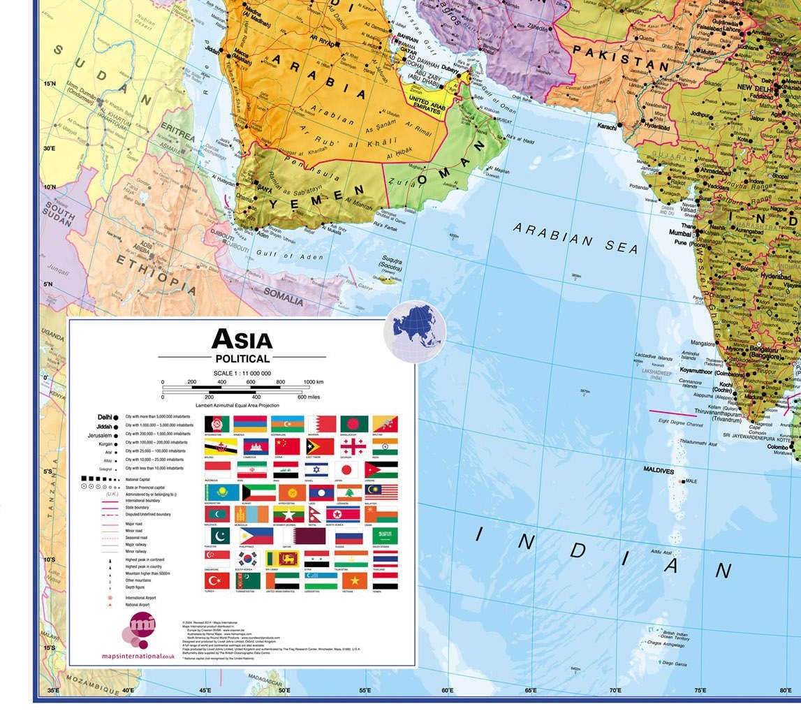 Maps International's political wall map of Asia shows all countries from Turkey in the West to Japan in the East, down to Indonesia in the South of Asia. The largest and most populated continent, Asia has a lot to fit onto a map! Rest assured though, with Maps International's high quality of mapping nothing is missed out!