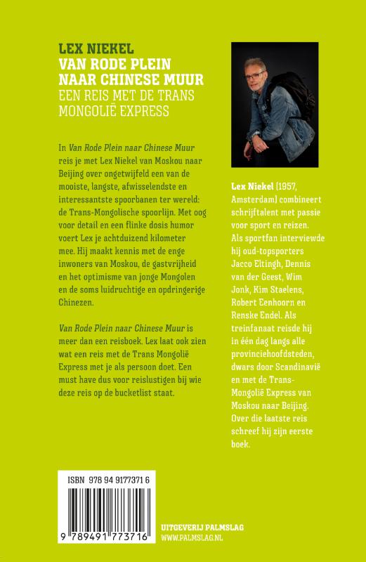 In 'Van Rode Plein naar Chinese Muur' reis je met Lex Niekel van Moskou naar Beijing over ongetwijfeld een van de mooiste, langste, afwisselendste en interessantste spoor banen ter wereld: de Trans-Mongolische spoorlijn. Met oog voor detail en een flinke dosis humor voert Lex je acht duizend kilometer mee. Hij maakt kennis met de enge inwoners van Moskou, de gastvrijheid en het optimisme van jonge Mongolen en de soms luidruchtige en opdringerige Chinezen. 'Van Rode Plein naar Chinese Muur' is meer dan een reisboek. Lex laat ook zien wat een reis met de Trans Mongolië Express met je als persoon doet. Een must have dus voor reislustigen bij wie deze reis op de bucketlist staat. Lex Niekel (1957, Amsterdam) combineert schrijftalent met passie voor sport en reizen. Als sportfan interviewde hij oud-topsporters Jacco Eltingh, Dennis van der Geest, Wim Jonk, Kim Staelens, Robert Eenhoorn en Renske Endel. Als treinfanaat reisde hij in één dag langs alle provinciehoofdsteden, dwars door Scandinavië en met de Trans-Mongolië Express van Moskou naar Beijing. Over die laatste reis schreef hij zijn eerste boek.