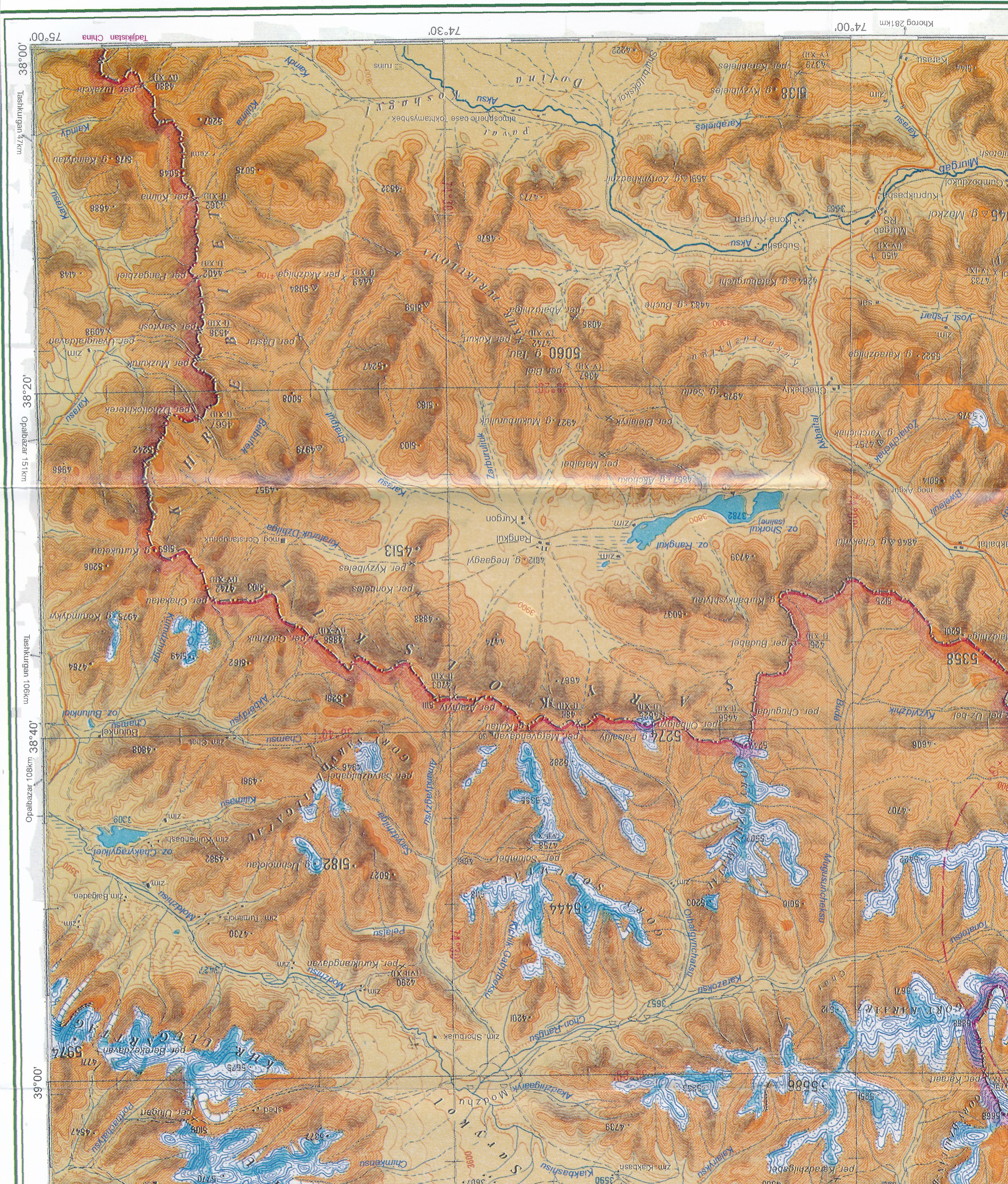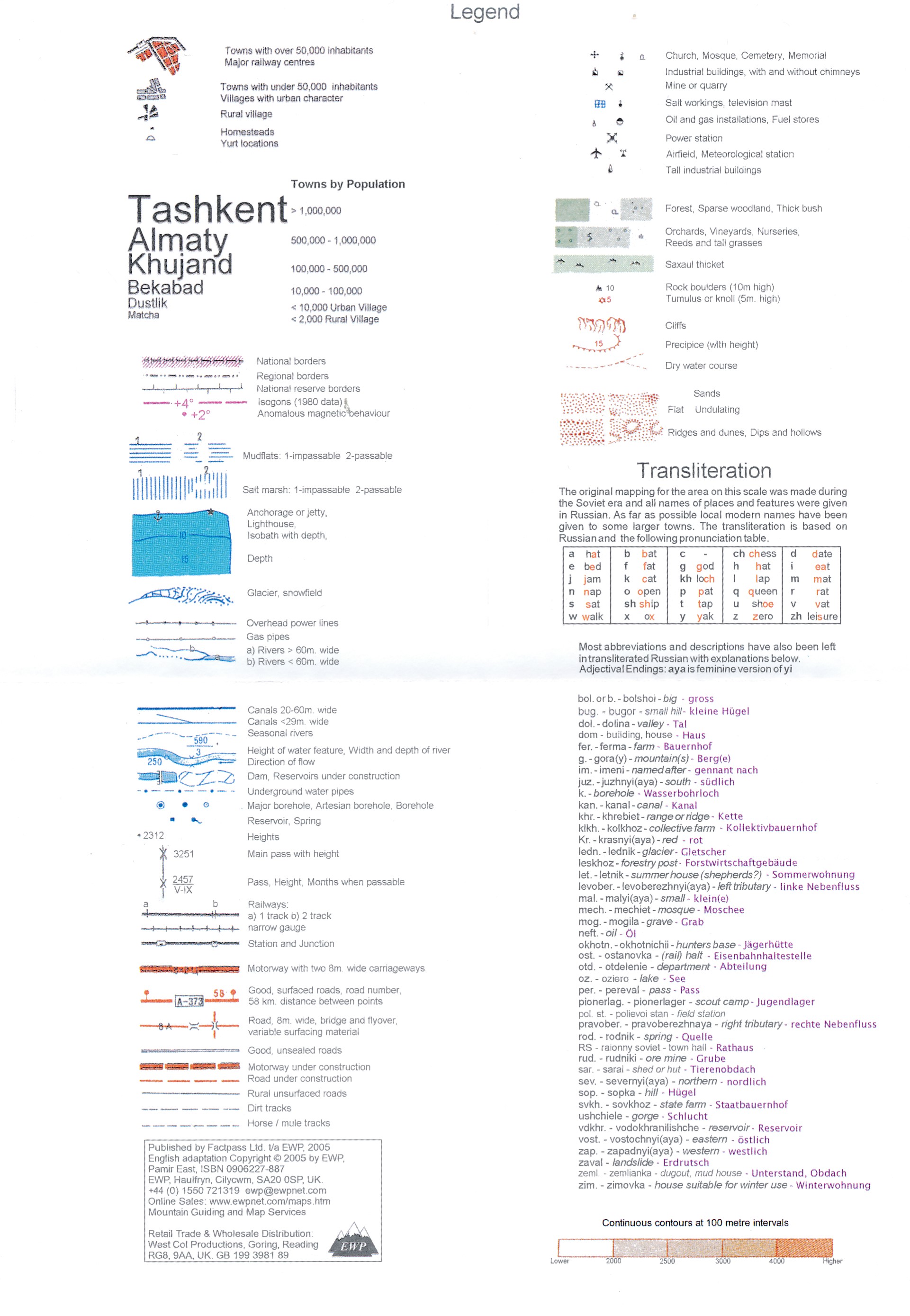Mooie, gedetailleerde topografische kaart van het grensgebied van China, Kirgizië en Tadjikistan. Met hoogtelijnen en reliëfkleuren, uitgebreide legenda en veel detail. Inclusief korte geografische woordenlijst.