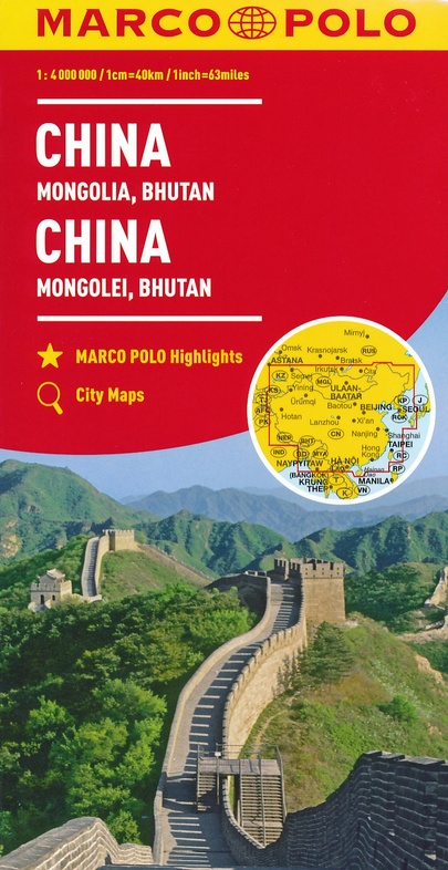 Duidelijke wegenkaart van China: alle wegen, zowel de verharde als belangrijke onverharde wegen zijn weergegeven. Mooie toeristisch interessante wegen die de moeite waard zijn, zijn groen gearceerd. Veel toeristische informatie is toegevoegd zoals de nationale parken, campings, kastelen en vliegvelden. Afstanden tussen belangrijke steden en benzinestations staan ook op de kaart. Een plaatsnamenregister ontbreekt niet.