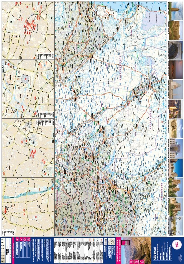 Tweetalige kaart (Engels en Duits) van de Zijderoute. Door ingetekende lengte- en breedtegraden is het gebruik van GPS mogelijk. Met hoogtelijnen en uitgebreid wegennetwerk: daarnaast worden ook de afstanden tussen belangrijke plaatsen duidelijk leesbaar weergegeven. Het kleurgebruik is zodanig dat je een goede indruk krijgt van hoogteverschillen en soorten landschap. Natuurlijk staan de toeristische bezienswaardigheden duidelijk vermeld.