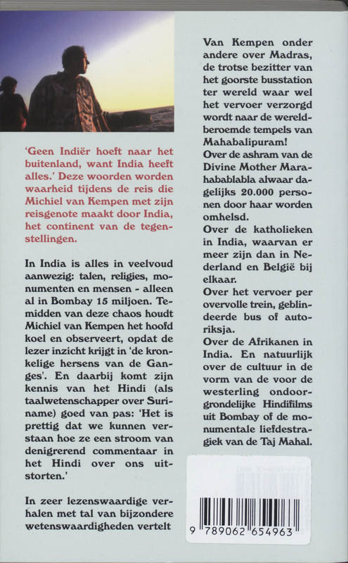 In India is alles in veelvoud aanwezig: talen, religies, monumenten en mensen - alleen al in Bombay 15 miljoen. Temidden van deze chaos houdt Michiel van Kempen het hoofd koel en observeert, opdat de lezer inzicht krijgt in 'de kronkeligehersens van de Ganges'. En daarbij komt zijn kennis van het Hindi (als taalwetenschapper over Suriname) goed van pas: 'Het is prettig dat we kunnen verstaan hoe ze een stroom van denigrerend commentaar in het Hindi over ons uitstorten'.