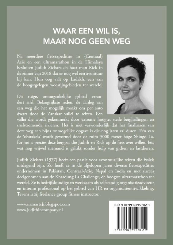Waar een wil is, maar nog geen weg Na meerdere fietsexpedities in (Centraal) Azië en een ultramarathon in de Himalaya besluiten Judith Zielstra en haar man Rick in de zomer van 2018 dat er nog wel een avontuur bij kan. Hun oog valt op Ladakh, een van de hoogstgelegen woestijngebieden ter wereld. Dit ruige, ontoegankelijke gebied verandert snel. Belangrijkste reden: de aanleg van een weg die het mogelijk maakt om per auto dwars door de Zanskar vallei te reizen. Een vallei die wordt gekenmerkt door extreme hoogte, steile berghellingen en snelstromende rivieren. Het is niet verwonderlijk dat het finaliseren van deze weg een bijna onmogelijke opgave is die nog jaren zal duren. Eén van de ‘obstakels’ wordt gevormd door de ruim 5000 meter hoge Shingo La. En het is precies deze bergpas die Judith en Rick op de fiets over willen. Iets wat nog vrijwel niemand is gelukt zonder hulp van gidsen en lastdieren. Judith Zielstra (1977) heeft een passie voor avontuurlijke reizen die fysiek uitdagend zijn. Zo heeft ze in de afgelopen jaren diverse fietsexpedities ondernomen in Pakistan, Centraal-Azië, Nepal en India en met succes deelgenomen aan de Khardung La Challenge, de hoogste ultramarathon ter wereld. Ze is bedrijfskundige en werkzaam als zelfstandig organisatieadviseur en interim professional op het gebied van HR en organisatieontwikkeling. Tevens is zij freelance group fitness instructor. www.namastejr.blogspot.com www.judithincompany.nl