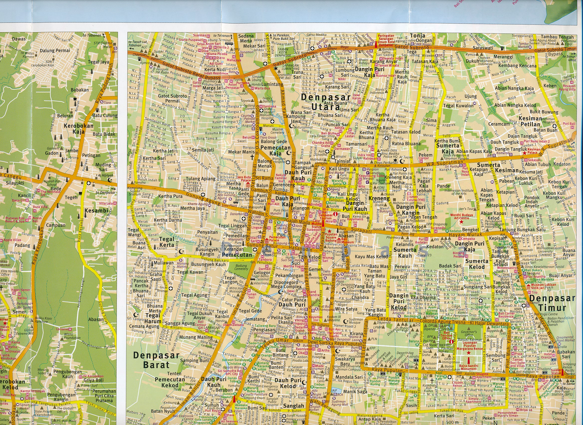 Hele goede kaart van vooral het zuiden van Bali. Veel details voor de toeristische plaatsen met stadskaarten en bijv. Hotelaanduidingen.