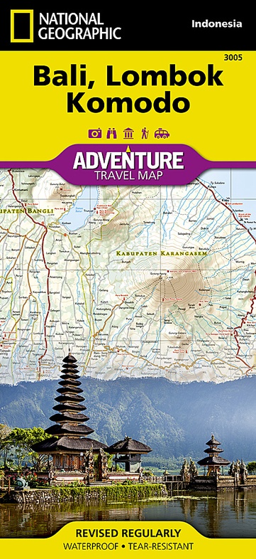 Wegenkaart van Bali, Lombok en Komodo met vermelding van veel bezienswaardigheden, nationale parken en attrakties. Watervast en scheurvast. Juist door deze vermeldingen onderscheidt de kaart zich van andere wegenkaarten.