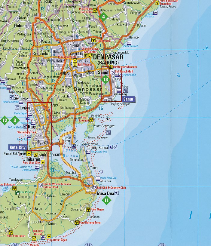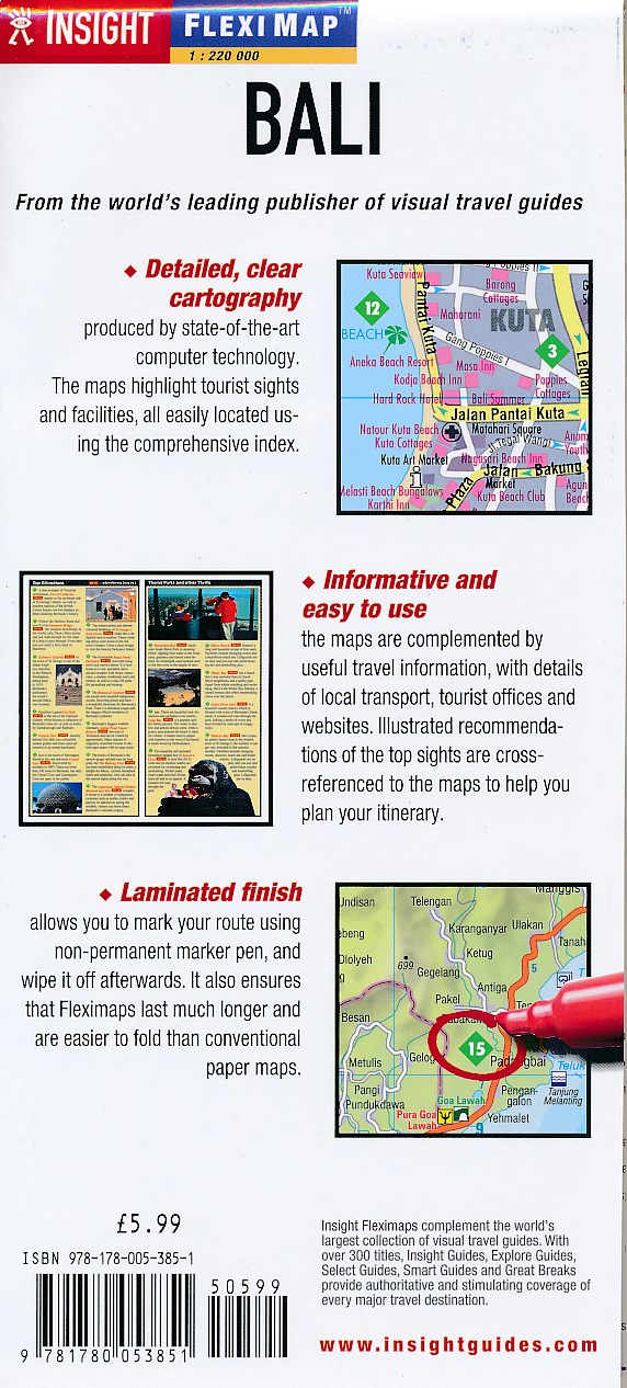 Geplastificeerde kaart van Bali, met register. Voor de 'gewone' toerist een handige kaart, geen groot formaat, overzichtelijk met alle belangrijke plaatsen goed weergegeven. Met stadsplattegronden van Kuta, Ubud en Sanur.