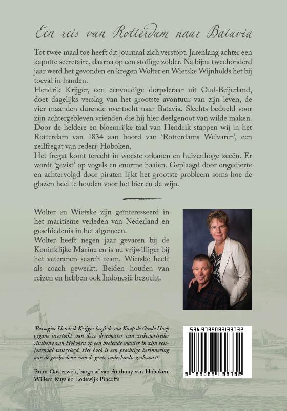 Een reis van Rotterdam naar Batavia Tot twee maal toe heeft dit journaal zich verstopt. Jarenlang achter een kapotte secretaire, daarna op een stoffige zolder. Na bijna tweehonderd jaar werd het gevonden en kregen Wolter en Wietske Wijnholds het bij toeval in handen. Hendrik Krijger, een eenvoudige dorpsleraar uit Oud-Beijerland, doet dagelijks verslag van het grootste avontuur van zijn leven, de vier maanden durende overtocht naar Batavia. Slechts bedoeld voor zijn achtergebleven vrienden die hij hier deelgenoot van wilde maken. Door de heldere en bloemrijke taal van Hendrik stappen wij in het Rotterdam van 1834 aan boord van ‘Rotterdams Welvaren’, een zeilfregat van rederij Hoboken. Het fregat komt terecht in woeste orkanen en huizenhoge zeeën. Er wordt ‘gevist’ op vogels en enorme haaien. Geplaagd door ongedierte en achtervolgd door piraten lijkt het grootste probleem soms hoe de glazen heel te houden voor het bier en de wijn. Wolter en Wietske zijn geïnteresseerd in het maritieme verleden van Nederland en geschiedenis in het algemeen. Wolter heeft negen jaar gevaren bij de Koninklijke Marine en is nu vrijwilliger bij het veteranen search team. Wietske heeft als coach gewerkt. Beiden houden van reizen en hebben ook Indonesië bezocht.