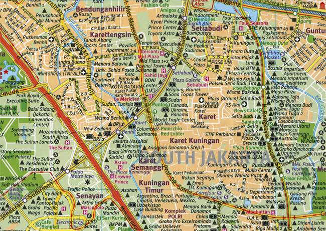 This map of Jakarta lists and describes all the "must-see" sights of the city, and also includes hotel listings and useful travel tips. The map is double sided with north Jakarta on one side and south Jakarta on the other. The location of hotels, transport facilities, banks, restaurants, shops and museums are all clearly marked.