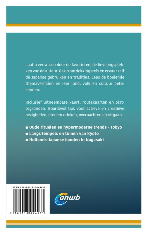 Verken Japan op een andere manier met de uitgebreide ANWB Ontdek reisgids Japan! Natuurlijk mag je bezienswaardigheden zoals het Imperial Palace, de drukke straten van Tokyo en het herdenkingspark in Hiroshima niet missen, maar ga ook eens van de gebaande paden en neem de boot naar het heilige eiland Miyajima, bezoek de grote Boeddha van Kamakura of verken Kyoto per fiets. Deze reisgids biedt naast praktische tips over routes, hotels en vervoer ook originele ontdekkingstochten door het land. De auteur laat juist díe plekjes zien waar de andere toeristen aan voorbij lopen. Achter in de handzame gids zit een uitneembare kaart. Kortom: deze reisgids is een onmisbare reisgezel tijdens je rondreis door Japan.