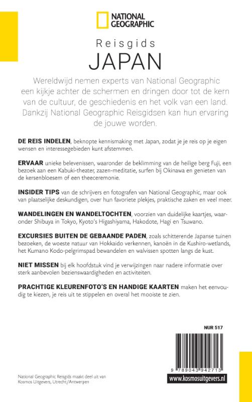 De National Geographic Reisgids Japan voert je langs bekende plekken als de majestueuze Fuji-vulkaan, keizerlijk Kyoto, hypermodern en flitsend Tokyo en vele andere schitterende Japanse bezienswaardigheden. Je maakt kennis met unieke belevenissen als het bijwonen van een Kabuki-voorstelling of een theeceremonie, surfen bij Okinawa en zazen-meditatie. Ga buiten de gebaande paden door de woeste natuur van Hokkaido te verkennen of te kanoën in de Kushiro-wetlands. De National Geographic Reisgids Japan is een complete kennismaking met Japan voor reizigers die verder willen gaan en het land in al zijn aspecten willen leren kennen. Inclusief: • Prachtige foto’s en gedetailleerde kaarten • Insider tips voor bijzondere excursies en ervaringen • Diepgaande en historische informatie over het land zelf • Ideaal voor cultuur- en natuurliefhebbers