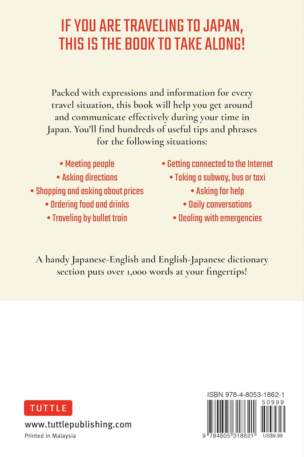 Packed with practical expressions and information for every travel situation, Japanese for Travelers Phrasebook & Dictionary helps you to get around and communicate effectively during your time in Japan.
