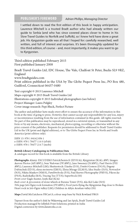 Billed 'the most beautiful country in the world' by The Times, Kyrgyzstan is a must-stop destination for anyone travelling through Central Asia or along the Silk Road. Take in the majesty of the celestial Tien Shan mountains, spend the night in a yurt or Kyrgyz home, or trek in the Ala-Archa canyon, roaming grounds for the enigmatic snow leopard. The Bradt guide is an invaluable companion for anyone venturing into this off-the-beaten-track destination. With more maps and practical information than any other guide, Bradt's Kyrgyzstan details towns and villages not covered by the competition. Entertainingly written, it provides unparalleled background information, including an update on the country's political situation.