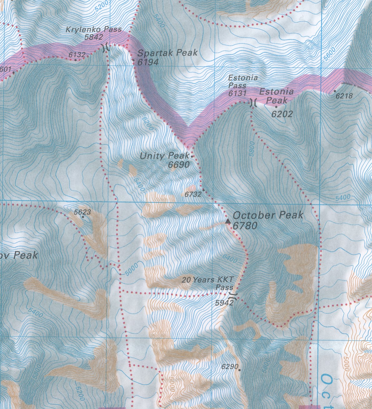 Een eenvoudige 7000-er in de Himalaya .... hij bestaat: Peak Lenin is relatief eenvoudig te belopen, los van alle weersinlvoeden natuurlijk! De kaart die hierbij het beste overzicht en detail biedt is deze .. De route is goed ingetekend, mooi kleurgebruik met hoogtelijnen, basecamps etc.