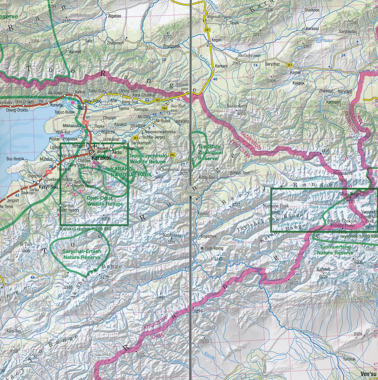 Heel duidelijke geplastificeeerde kaart van een deel van het Tien Shan gebergte. Met name de gebieden rond Karakol worden extra uitgelicht.