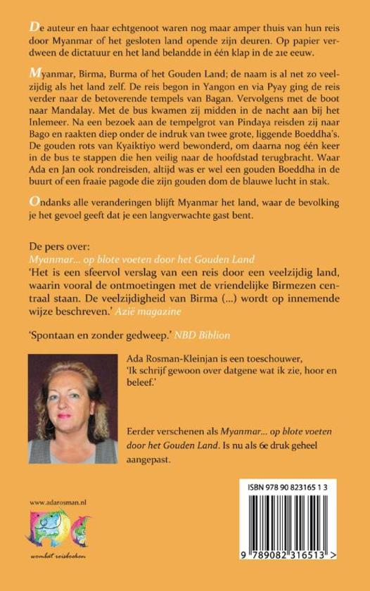 Myanmar, Birma, Burma of het Gouden Land; de naam is al net zo veelzijdig als het land zelf. Waar Ada Rosman-Kleinjan en haar echtgenoot Jan Rosman ook verbleven en waar zij ook rondreisden altijd was er wel een gouden Boeddha in de buurt of een fraaie pagode die zijn gouden dom de blauwe lucht in stak. Myanmar wordt dan ook niet voor niets het Gouden Land genoemd..