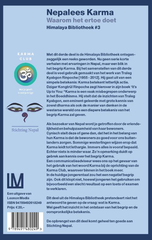 Bij het samenstellen van dit derde deel is veel gebruik gemaakt van het werk van Traleg Kyabgon Rinpoche [1955 - 2012]. Hij gaat uit van een simpele betekenis: Karma betekent letterlijk actie. Dzigar Kongtrül Rinpoche zegt hierover in zijn boek ‘It’s Up to You: “Karma is een vaak misbegrepen onderwerp in het Boeddhisme. Hij stelt dat de inzichten van Traleg Kyabgon, een eminent geleerde met grote kennis van zowel dharma als ook de manier van denken in de westerse wereld ons een diepere betekenis van het begrip Karma zal geven. Als bezoeker van Nepal word je getroffen door de vriende-lijkheid en behulpzaamheid van haar bewoners. Cynisch stelt deze of gene dan, dat het in het belang van hun Karma is dat de bewoners zo goed voor ons buiten-landers zorgen. Sommige westerlingen wijzen erop dat Karma leidt tot lethargie. Immers alles is vooraf bepaald. Echter niets is minder waar. Zo’n opmerking duidt op gebrek aan kennis over het begrip Karma. Een communicatieadviseur wees ons op het gevaar van het gebruik van het woord Karma bij de oprichting van de Karma Club, waarover binnen in het boek meer. In de huidige jongerentaal zou het een negatief begrip zijn. Ook dit klopt niet, hoewel jongeren het gebruiken om bijvoorbeeld een slecht resultaat op een toets of examen te verklaren.