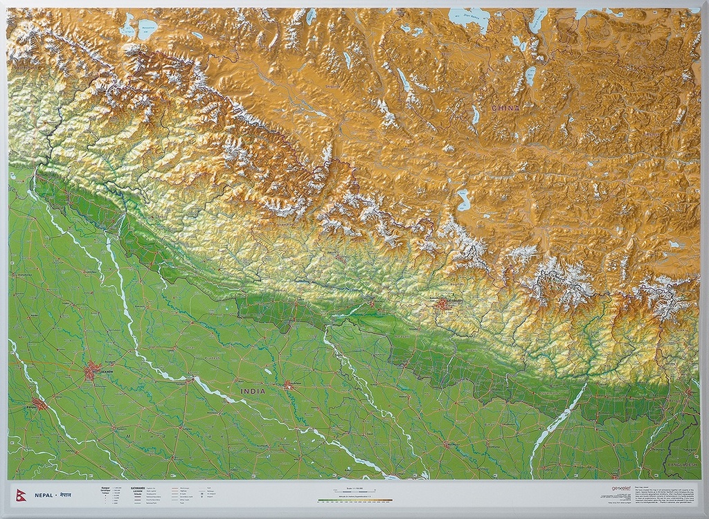 Gedetailleerd 3D-landschapsreliëf van Nepal, hydrografisch netwerk, markering van de steden, autowegen, bergnamen, hoogtelijnen en luchthavens .Prettig kleurgebruik en met voelbaar reliëf. Afmeting 77 x 57 cm.