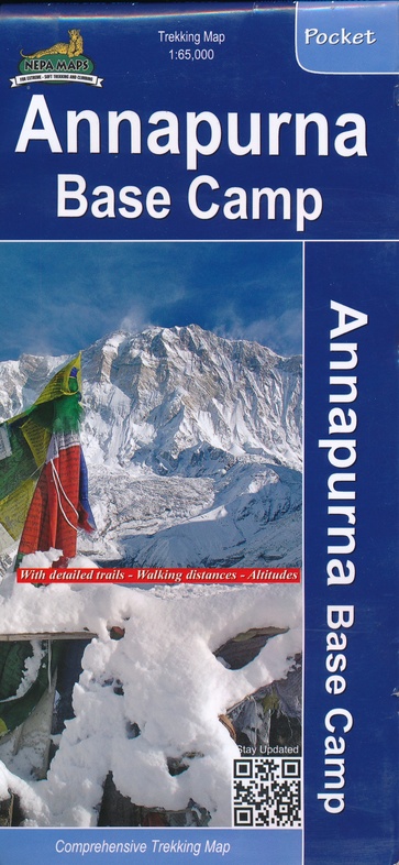 Bijzonder handige pocketmap van de trek naar Annapurna Base Camp en alle trekkingroutes tussen Pokhara en de zuidkant van de Annapurna, Poon Hill staat er ook nog net op. Vrij grove schaal, maar juist op trek goed te gebruiken, Details en begeleiding komt toch van de Nepali-crew, dit geeft meer een prachtig overzicht van hoe de route loopt en de hoge pieken die je ziet.