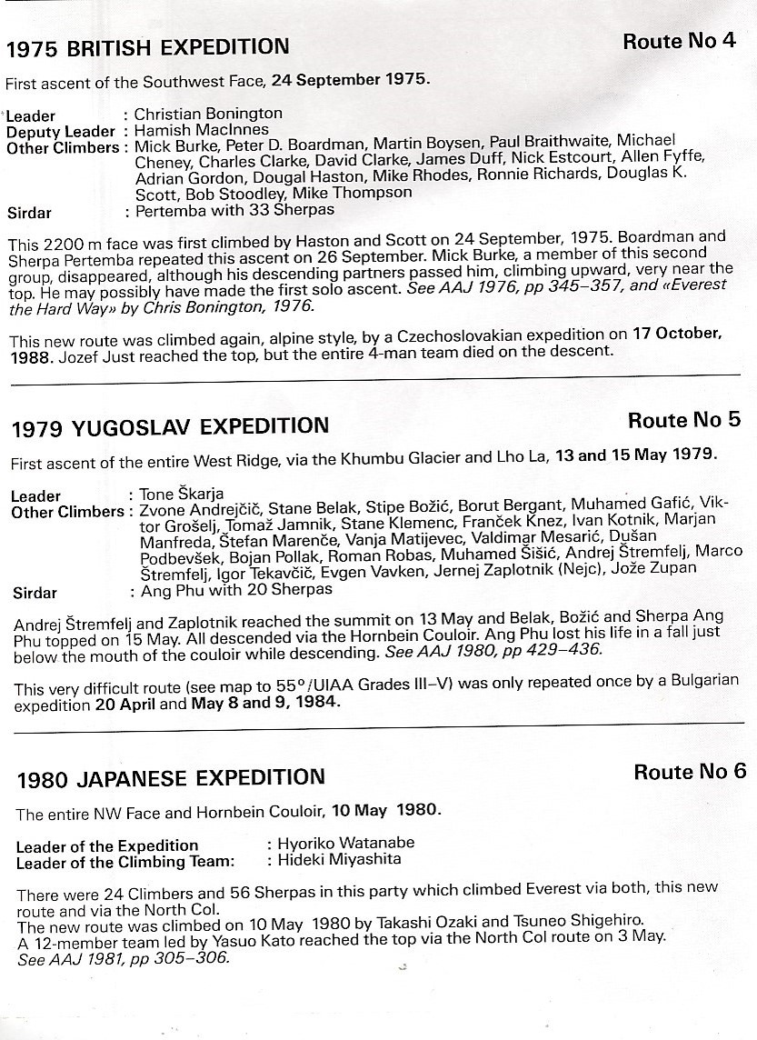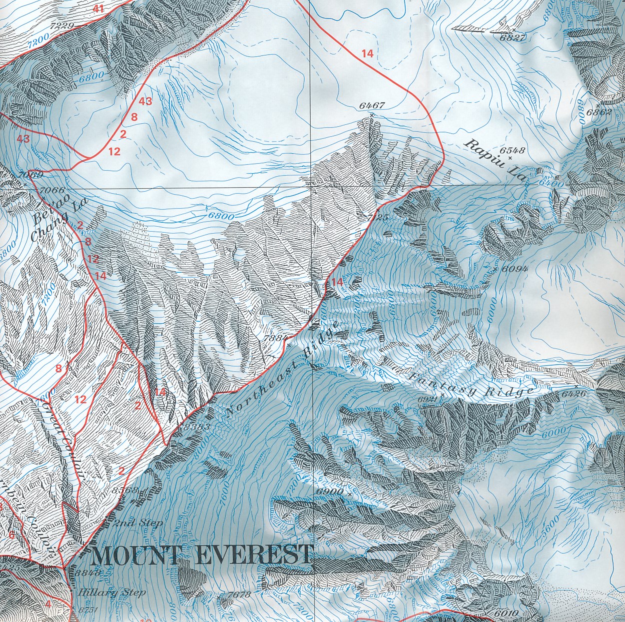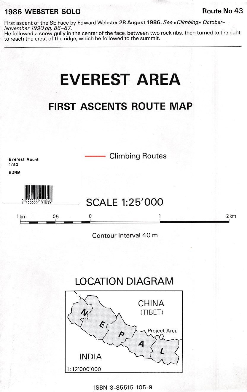 Prachtige zeer gedetailleerde klimkaart van de Mount Everest en andere toppen in de directe omgeving als Lhotse en Nuptse. Het basiskamp aan de Nepal-kant staat er nog net op. Op deze kaart staan alle routes ingetekend die als eerstbeklimming gelden, deze beklimmingen worden elders op de kaart nog eens nader gspecificeerd.