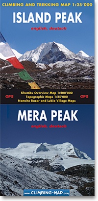 Topographic climbing maps from Island & Mera Peak 1:25'000, village maps of Lukla and Namche Bazar, description of climbing routes, Khumbu general map 1:200'000, Panorama view, vegetation illustrations, climatic diagram, GPS information