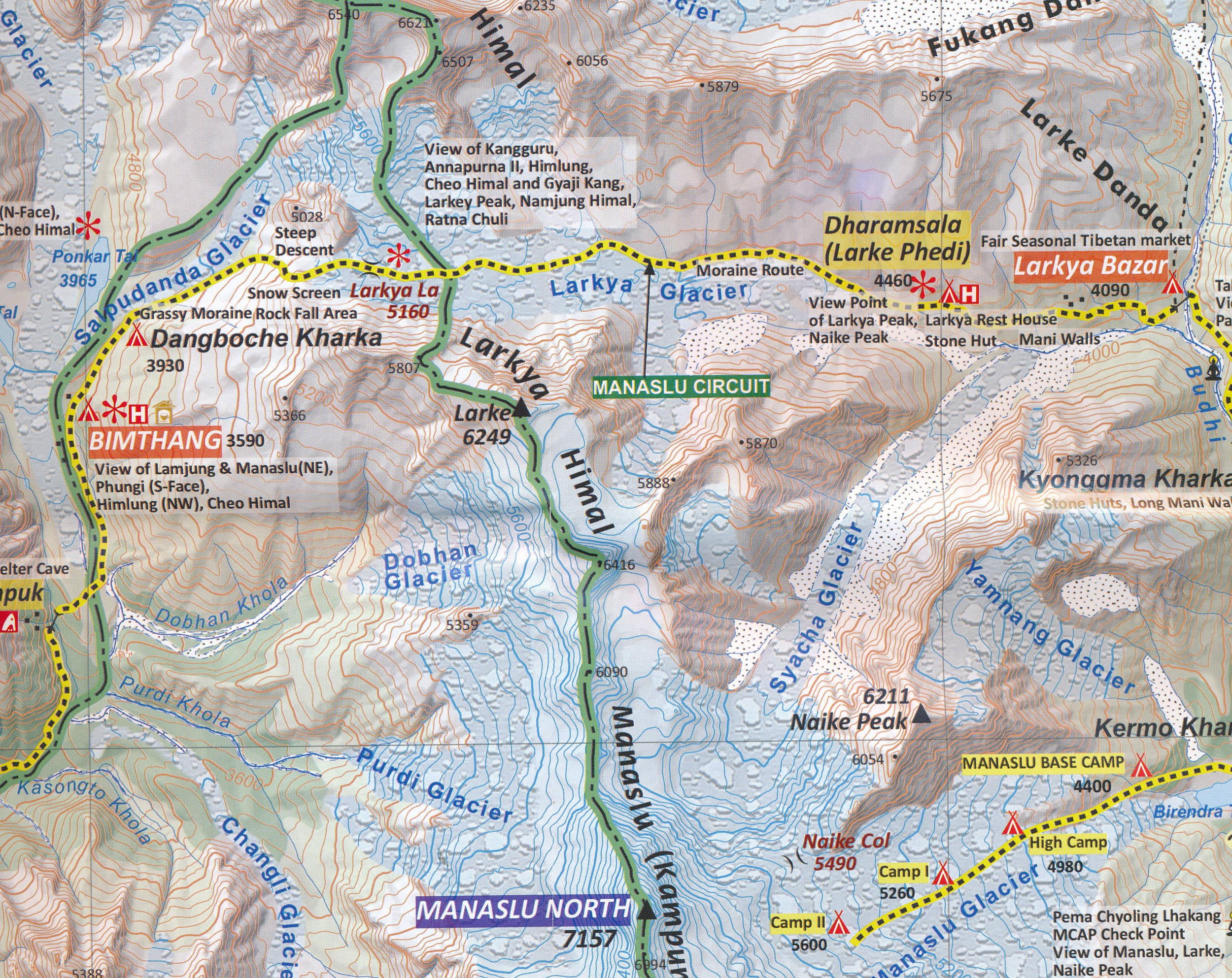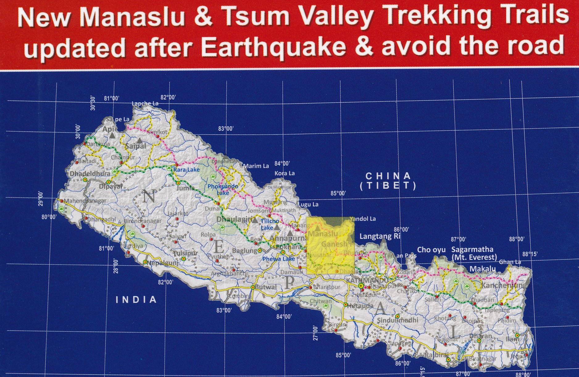 Zeer duidelijke trekking kaart van de route langs de Manaslu en meer naar het oosten nog richting en in de Tsum Valley. Alle noodzakelijke informqtie vind je op deze kaart: van hoogtelijnen en andere topografische details tot meer toeristisch handige informatie als plaatsen met lodges of waar je kunt kamperen. De ideale kaart om de Manaslu trek te lopen, ook al is deze kaart gedrukt op wat dik papier met kans op scheuren bij de naden ... op z'n Nepali!