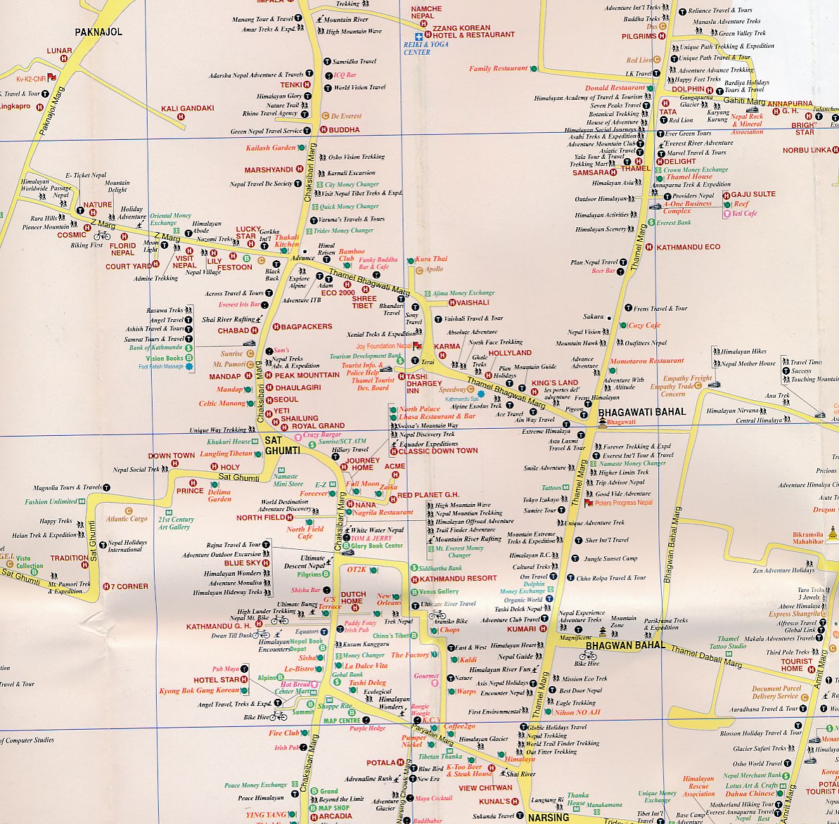 Handige pocket map van Kathmandu met uitsnedes met meer detail van o.a. Thamel, Durban Square en ook de belangrijkste pleinen en straten van Patan en Bahktapur. Op de andere kant een kaart met minder detail van Kathmandu met een groot stuk van de Kathmandu Valley er omheen. Met register.