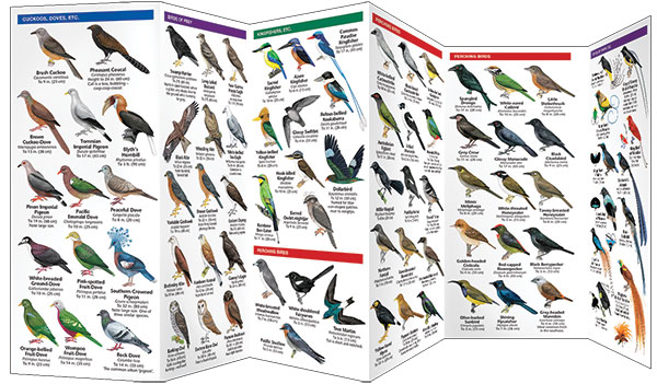Een bijzonder handige uitklapkaart met alle veelvoorkomende vogels van Nieuw-Guinea. Duidelijke illustraties, goede korte omschrijving van soort en leefgebied, geplastificeerd.